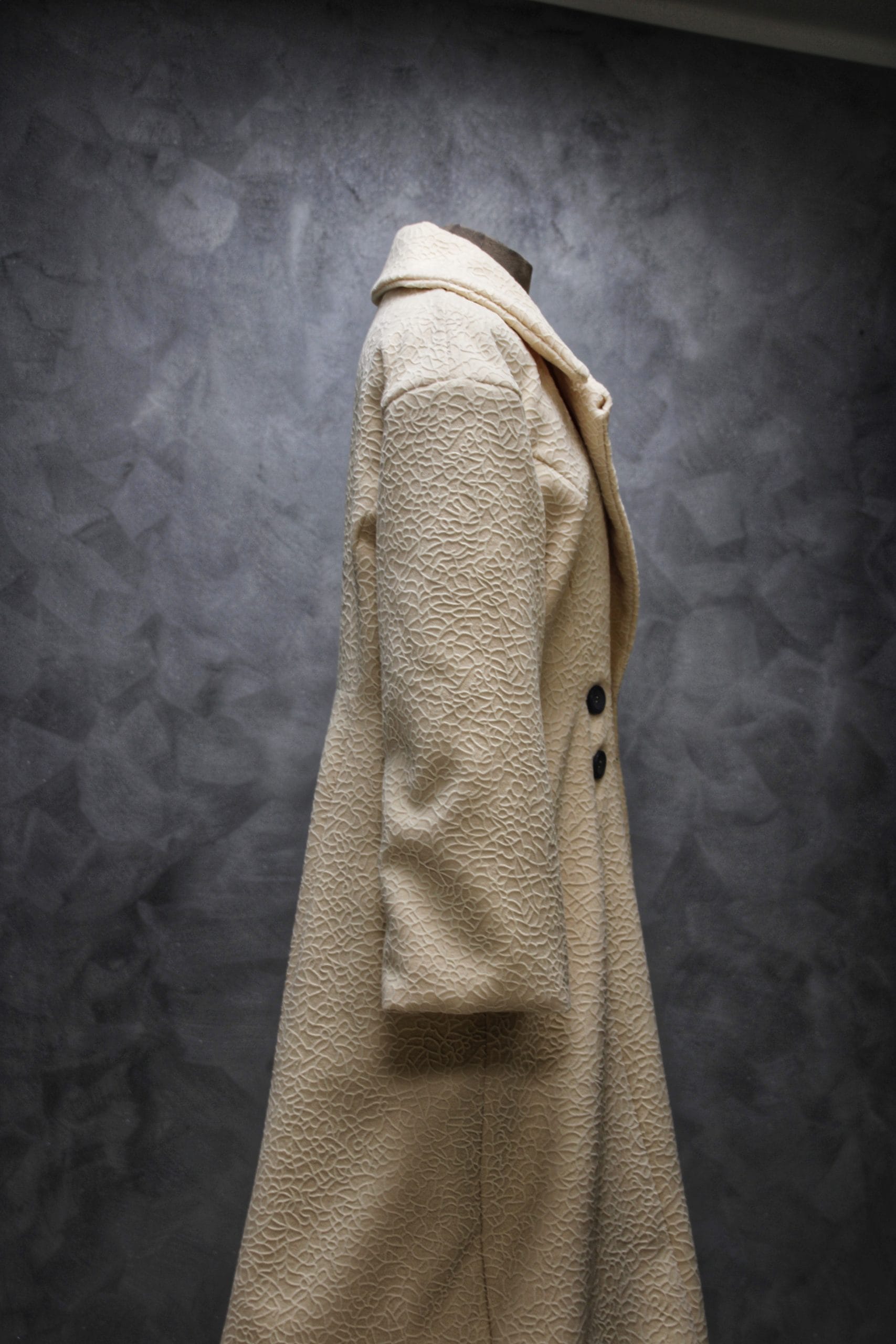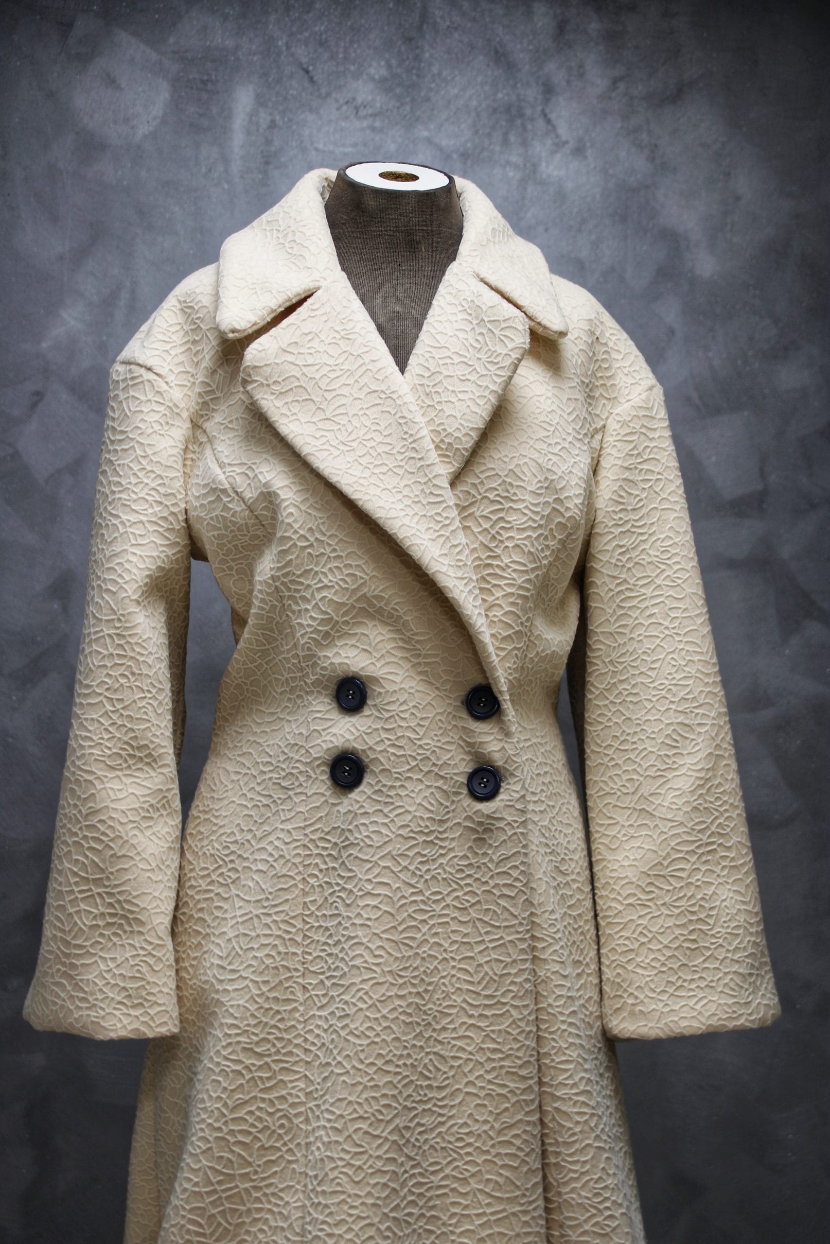 Strukiran kroj koji se od struka elegantno širi ostavlja utisak čarobne prašine u svakom koraku, dok otmena kragna koja prelazi u bogate revere daje poseban i prepoznatljiv stil dok ga nosiš.