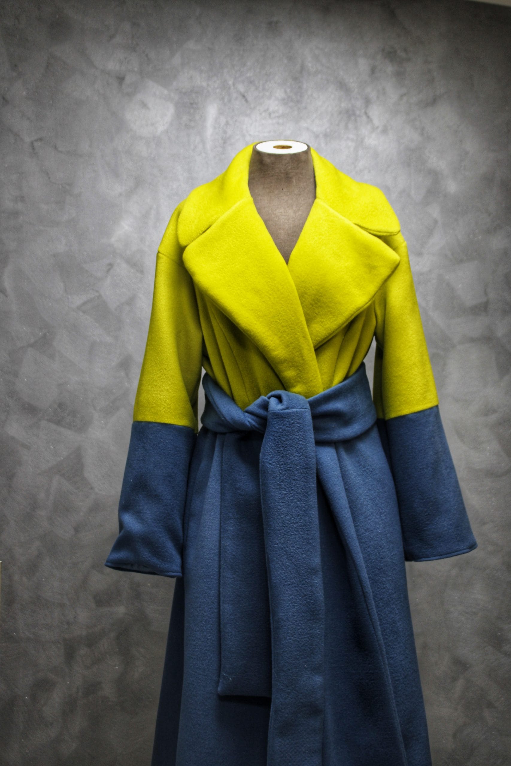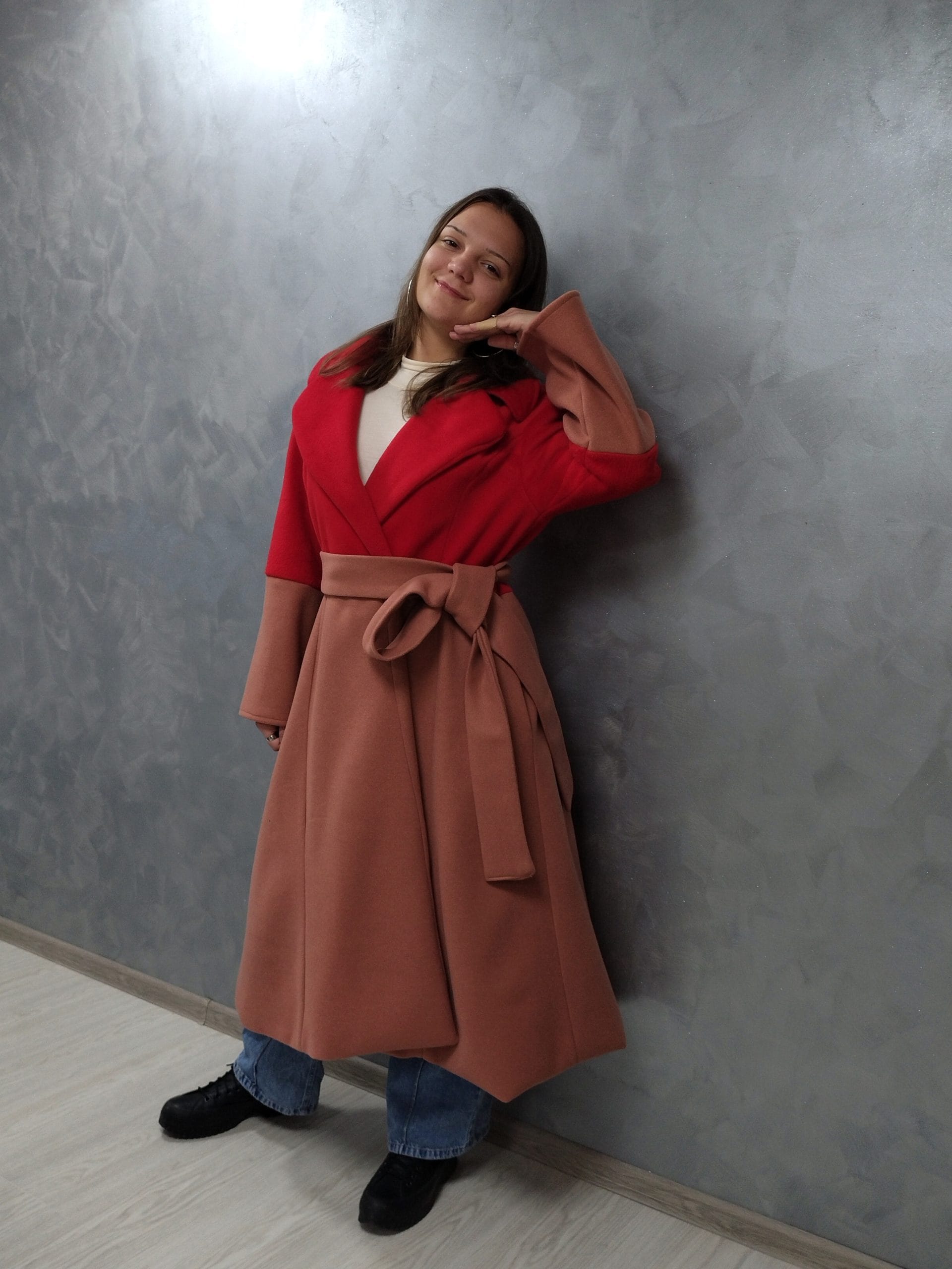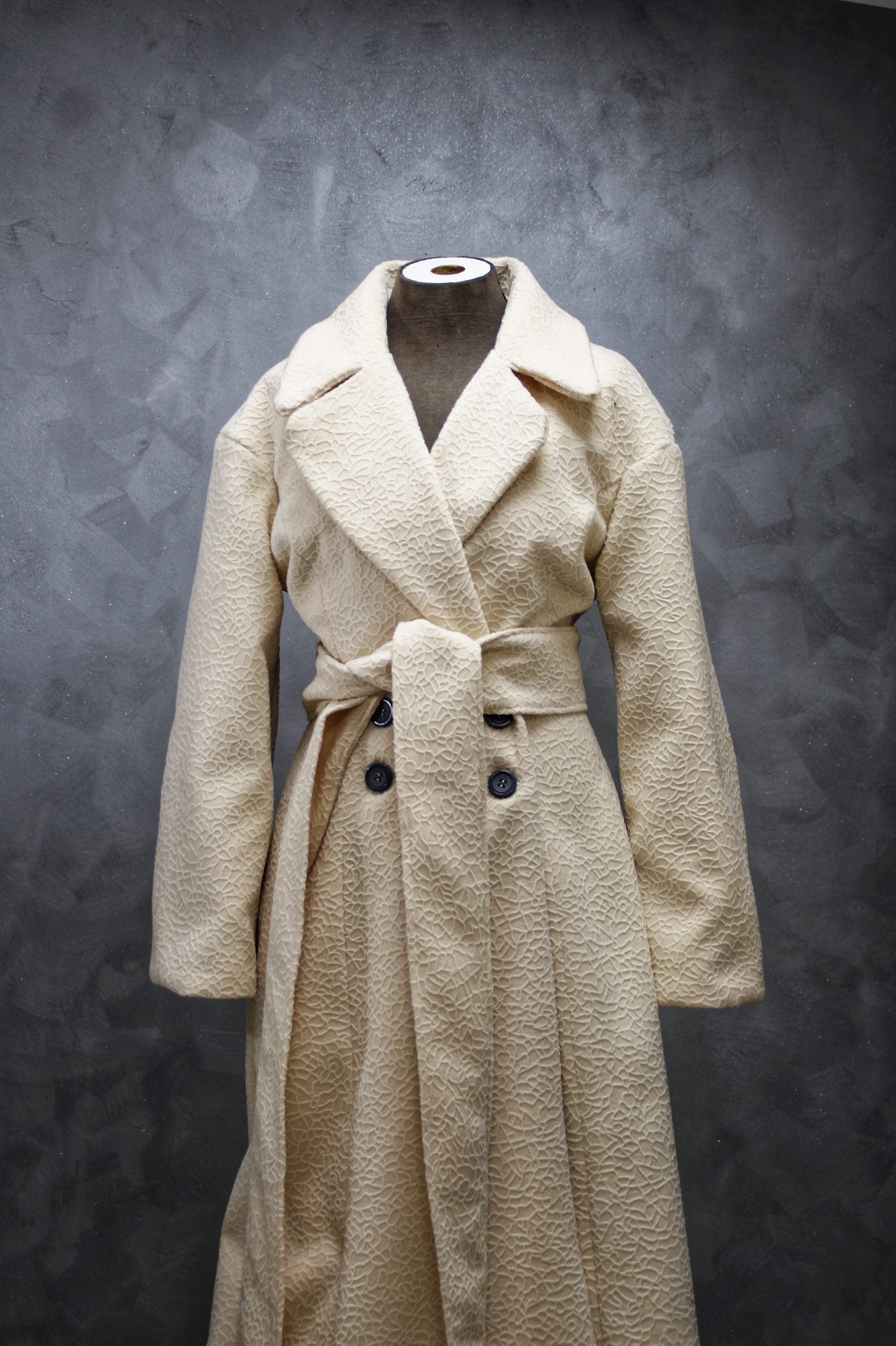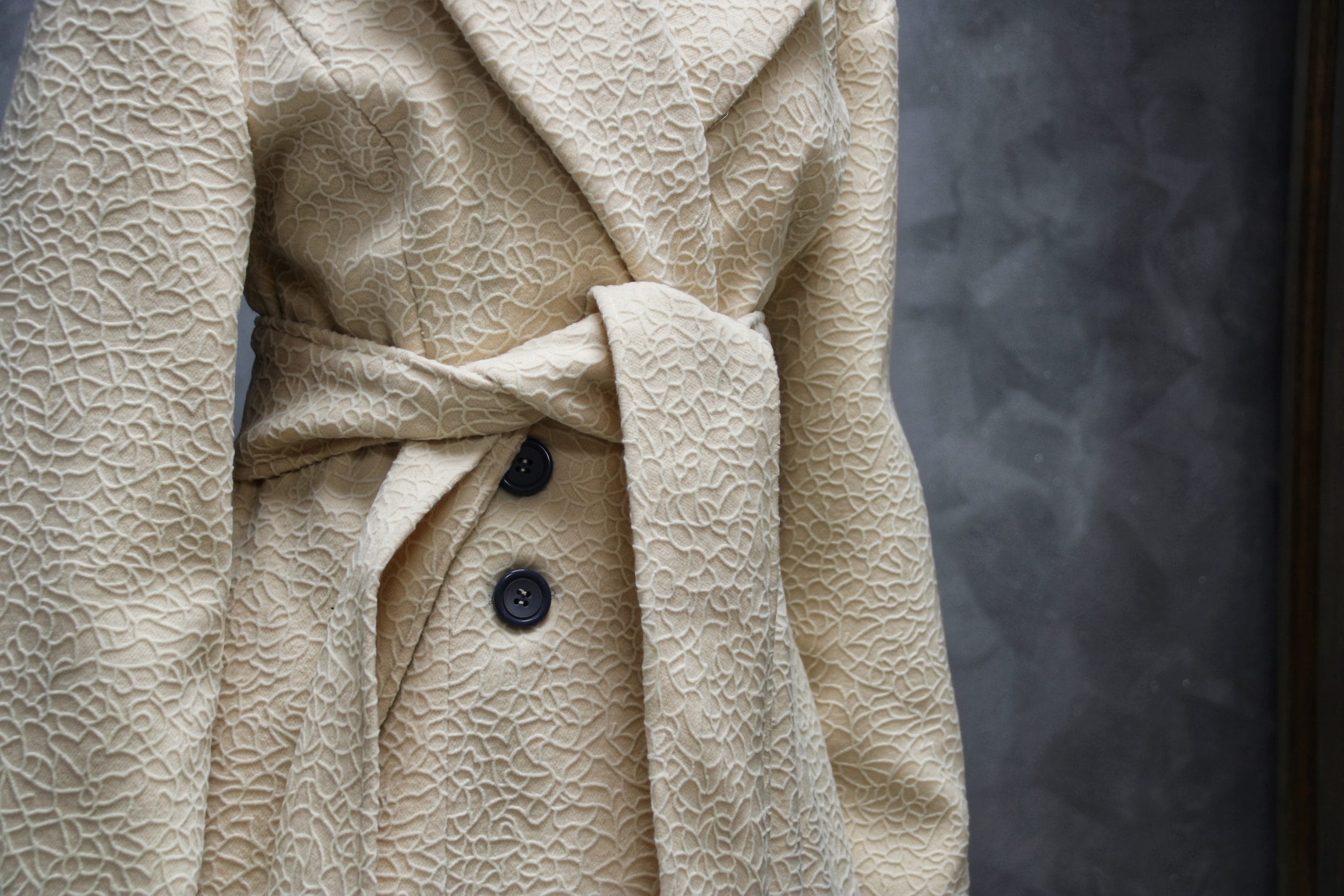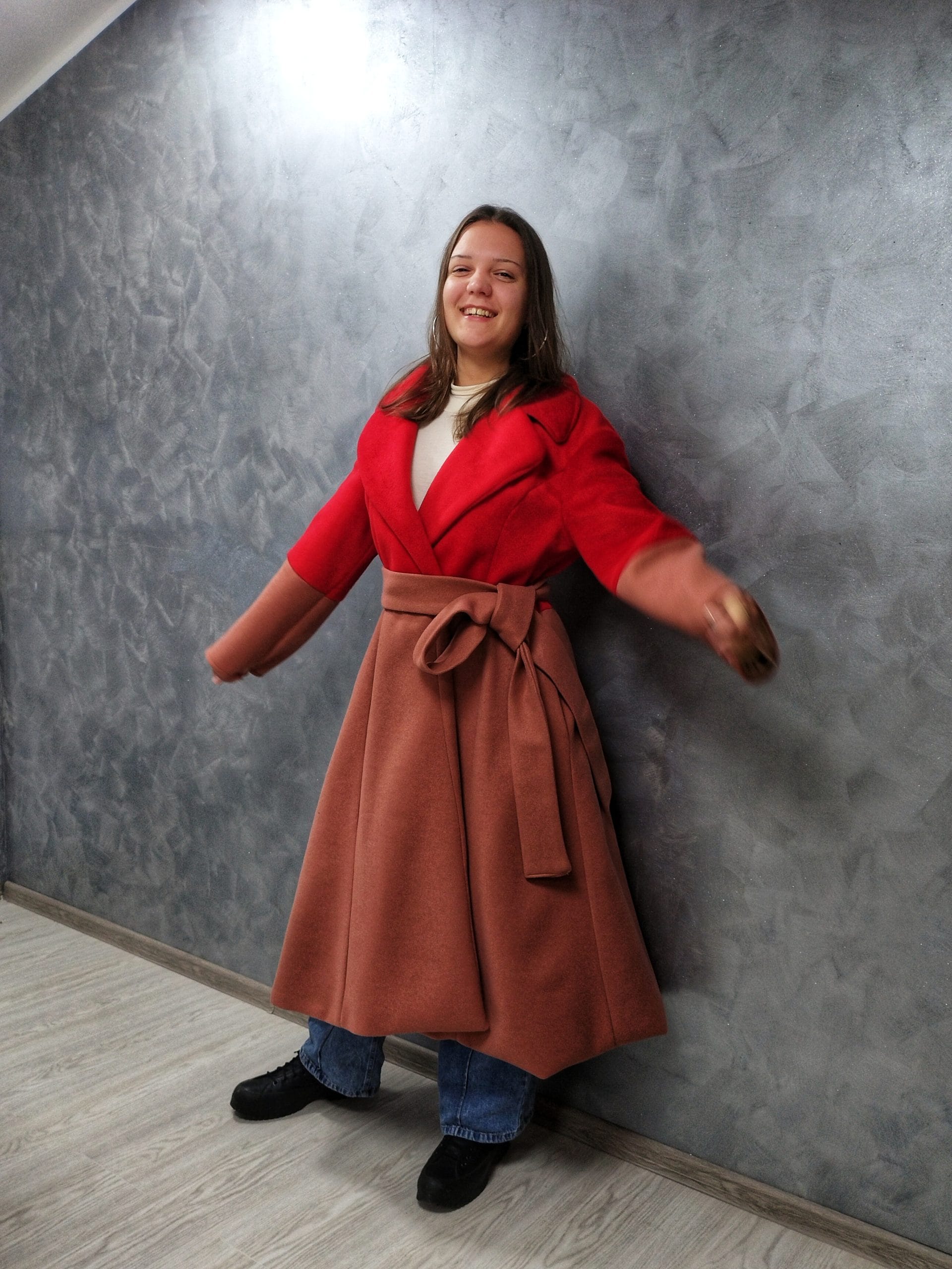 Veliki reveri dodaju dašak elegancije, dok široki rukavi i dugački pojas daju prepoznatljiv, ženstven izgled.
