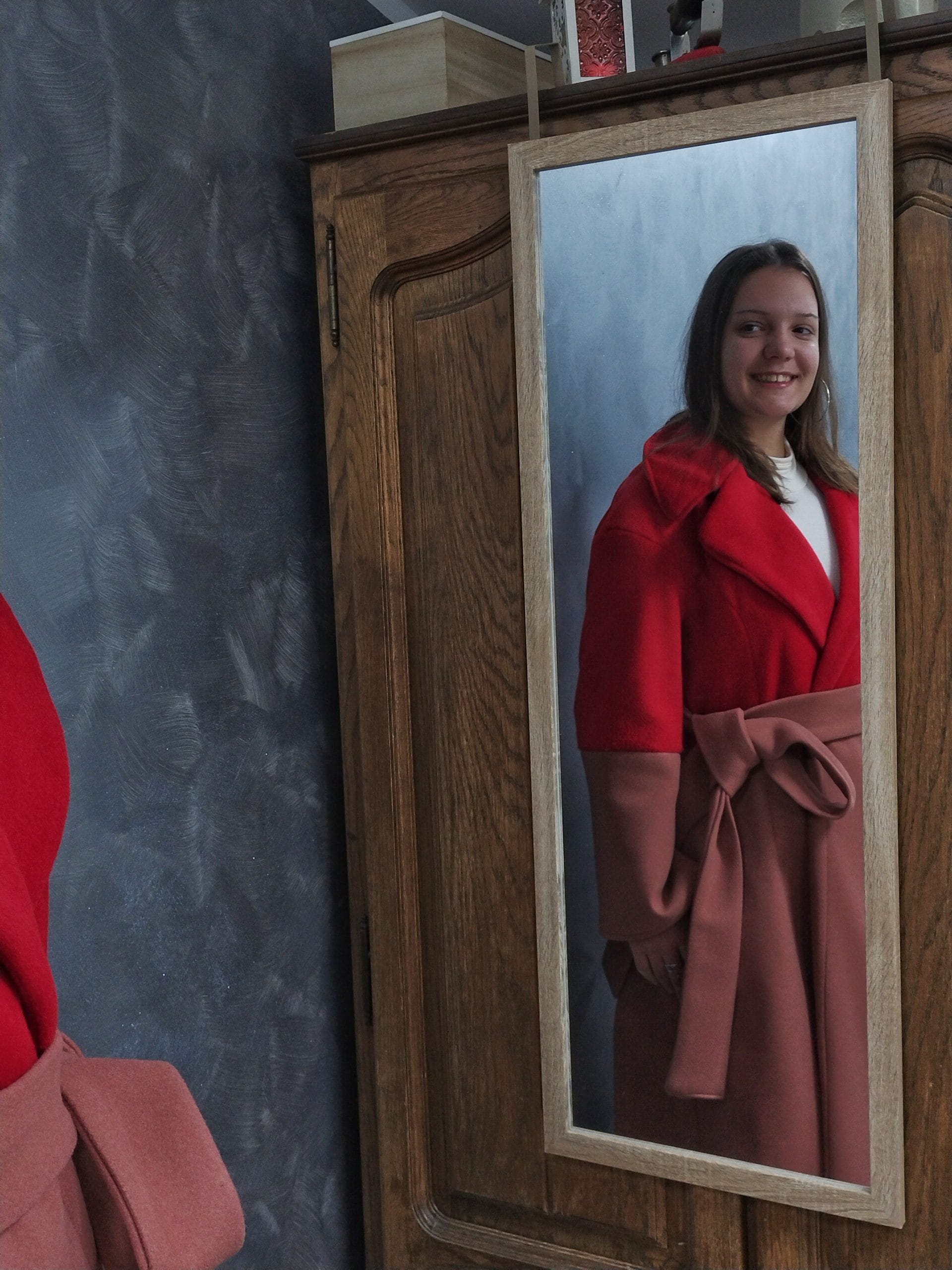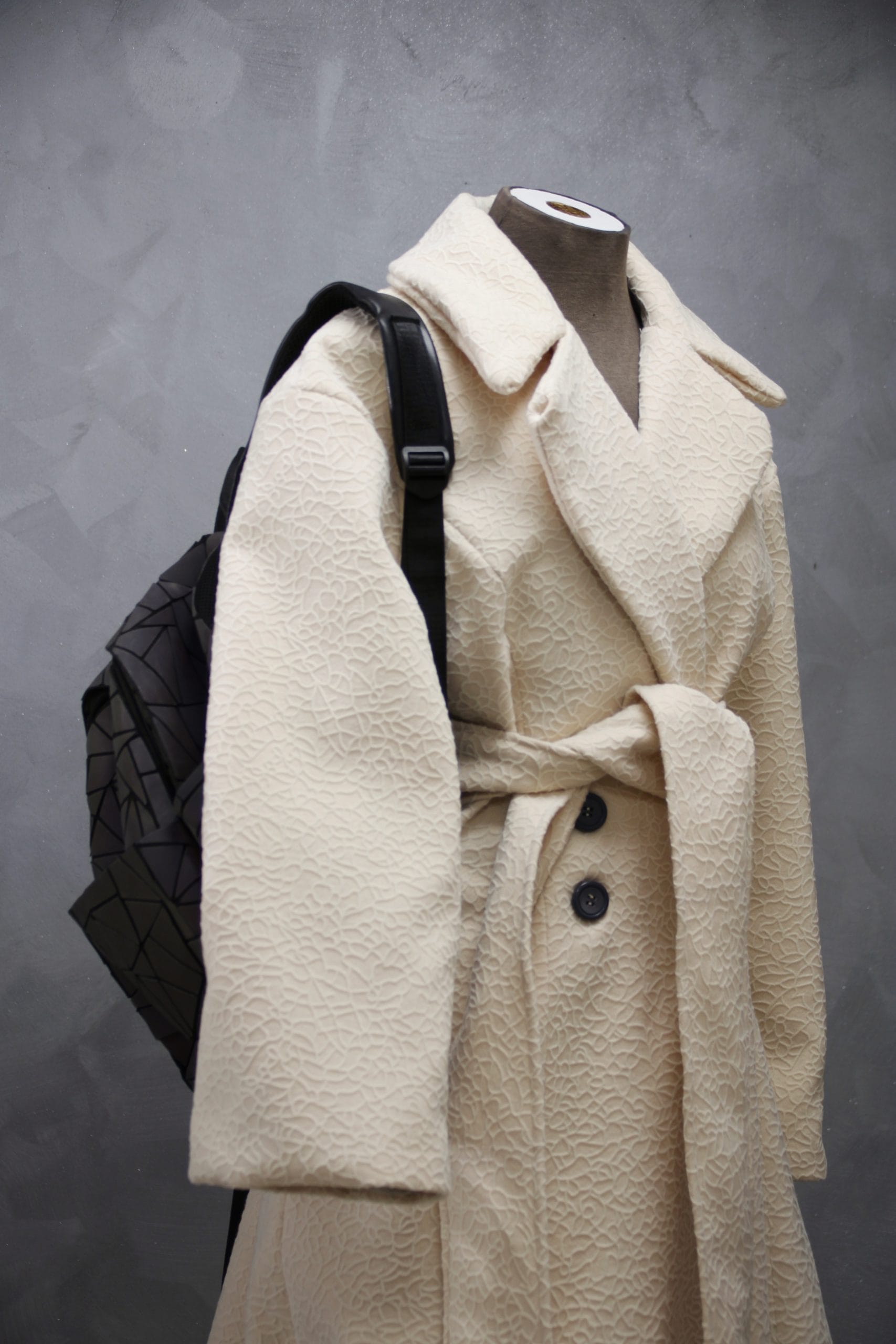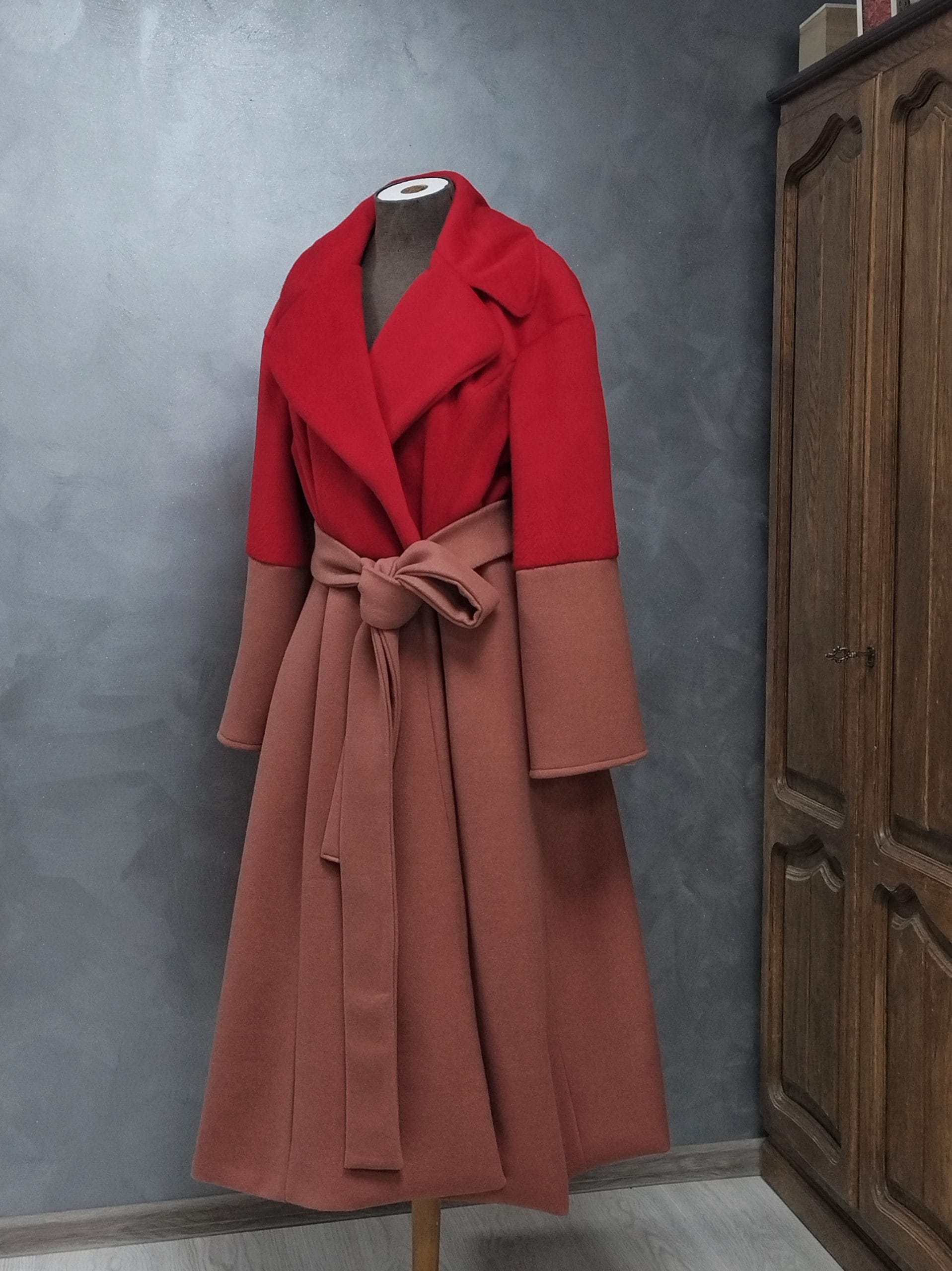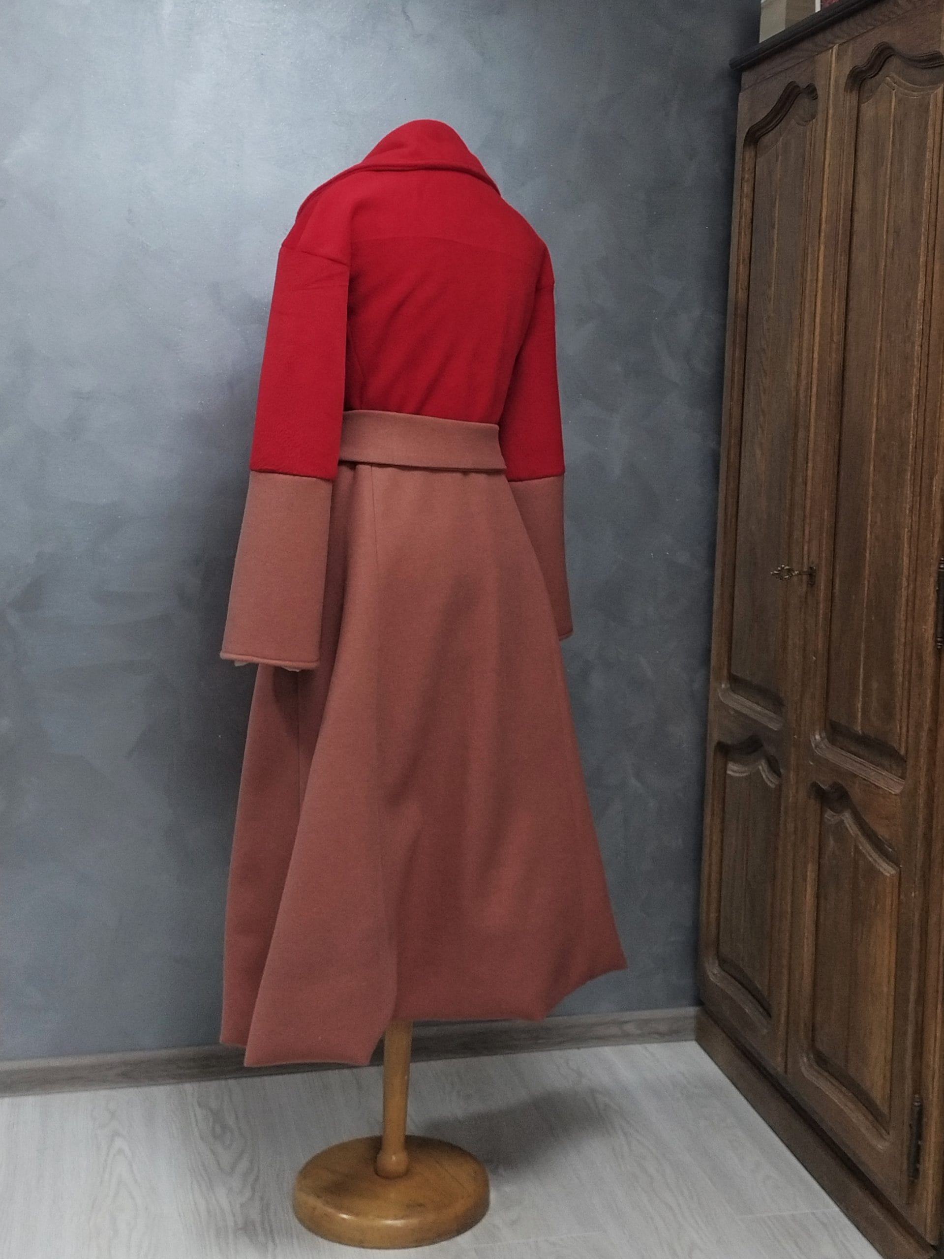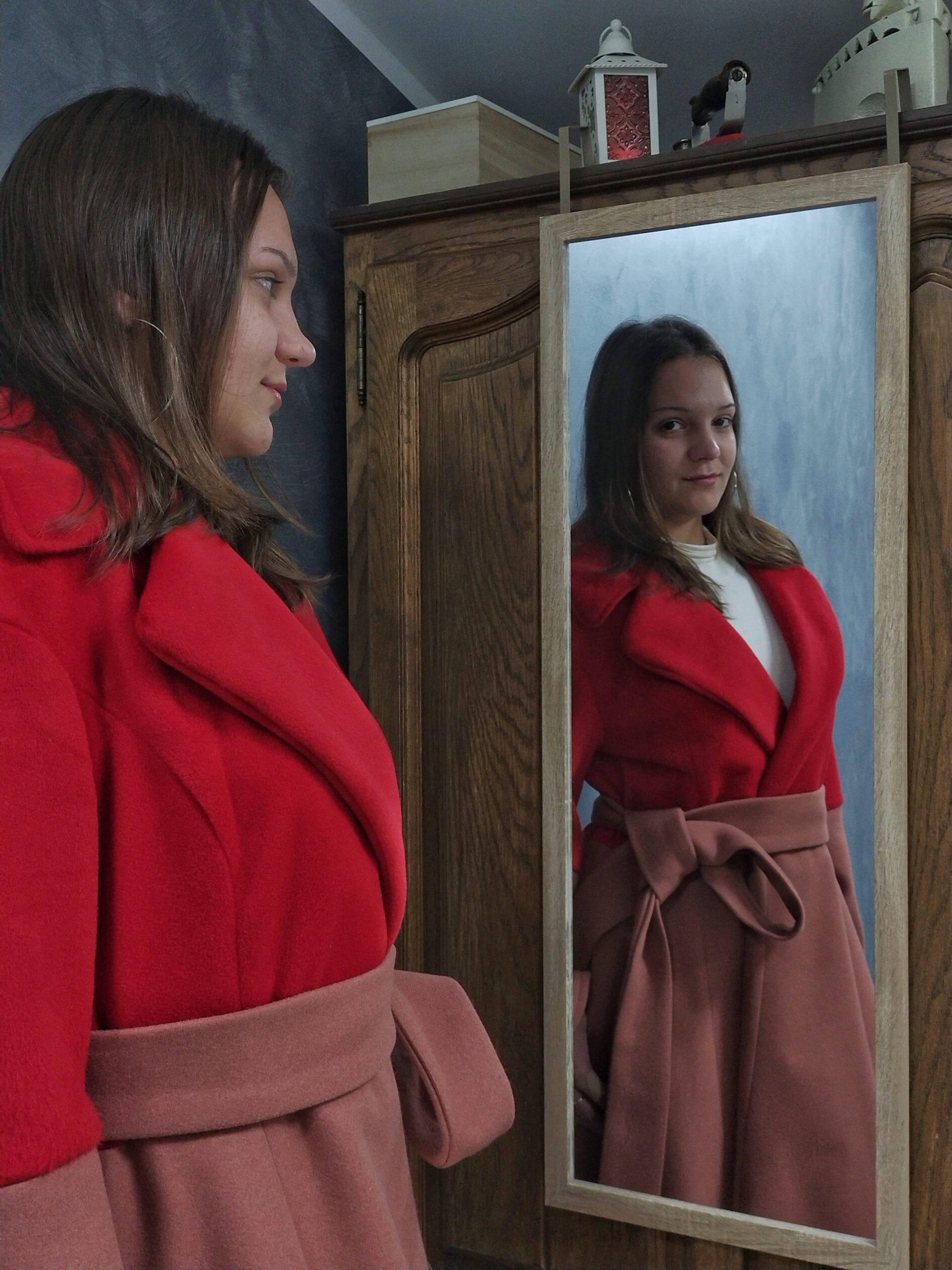 Veliki reveri dodaju dašak elegancije, dok široki rukavi i dugački pojas daju prepoznatljiv, ženstven izgled.