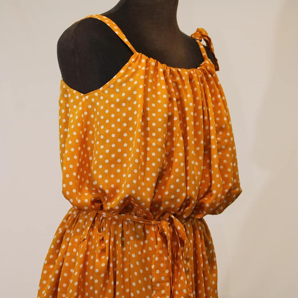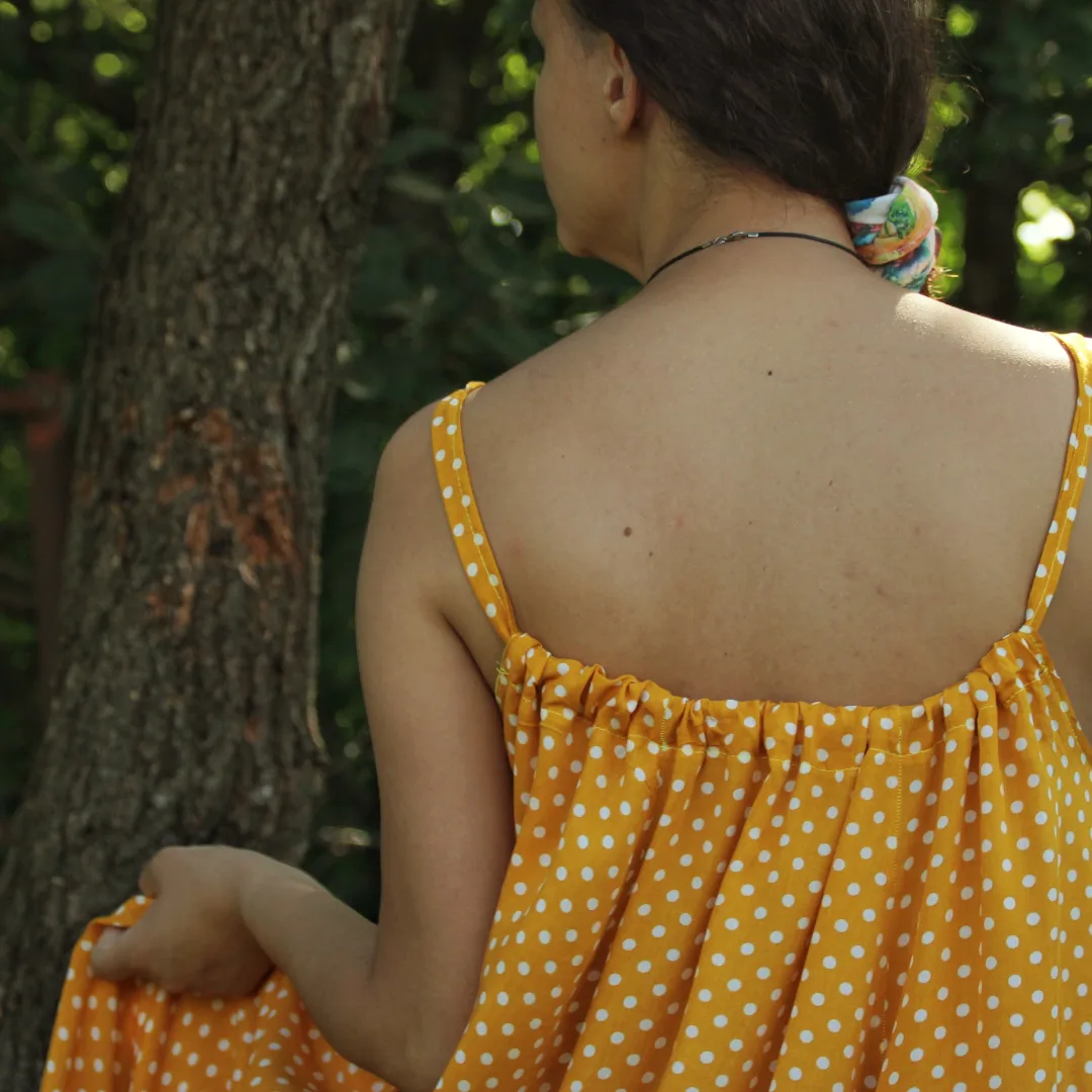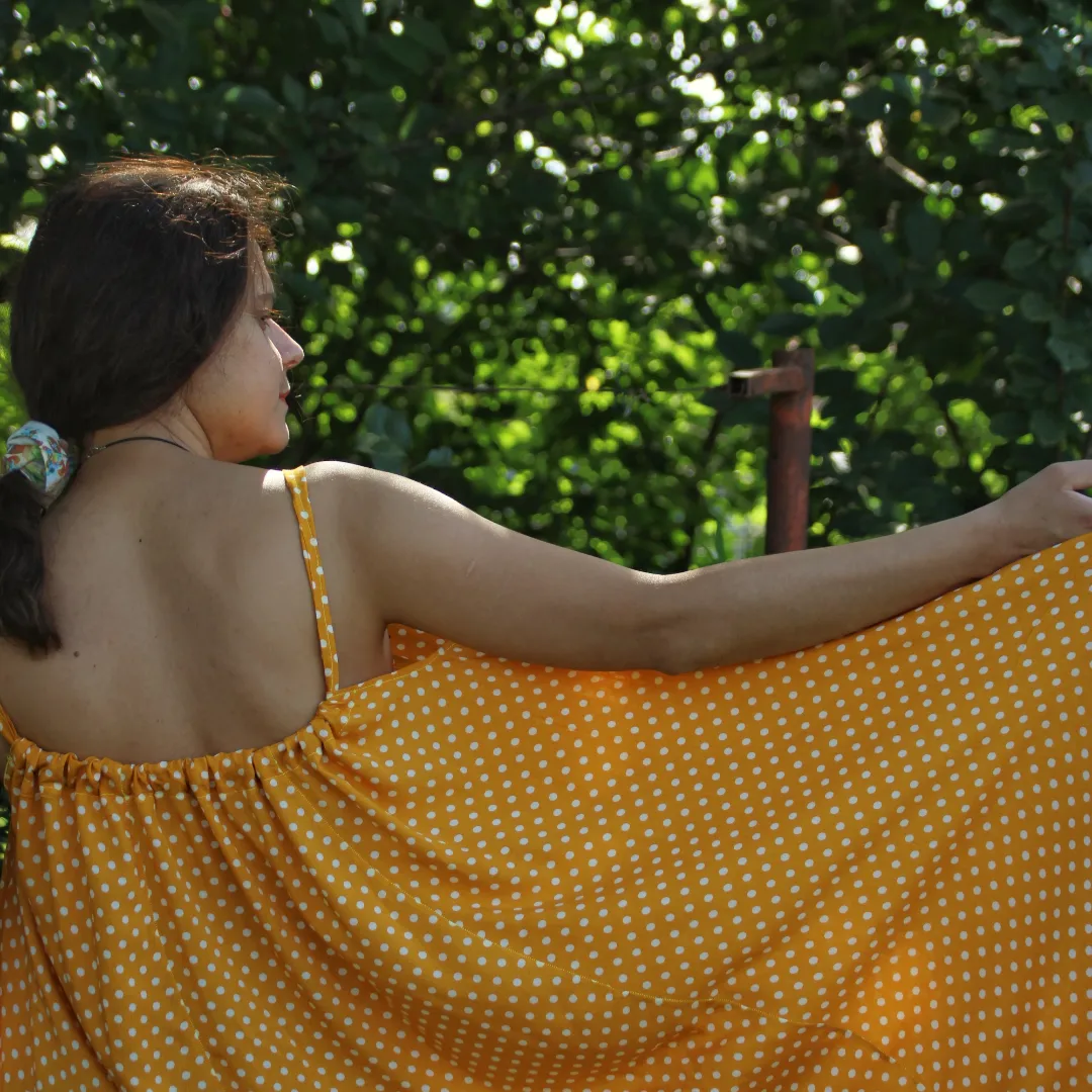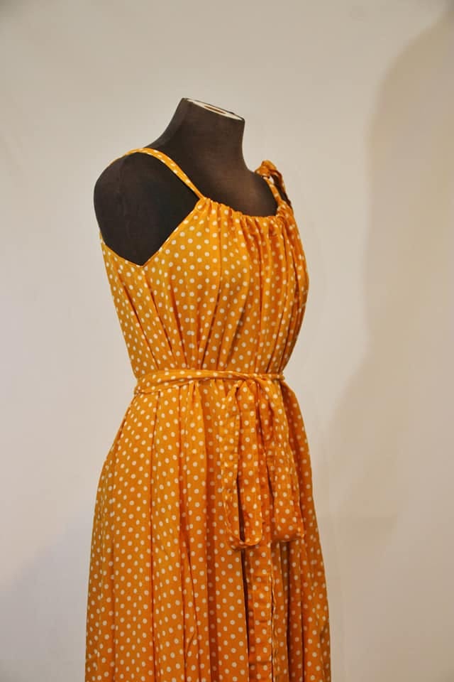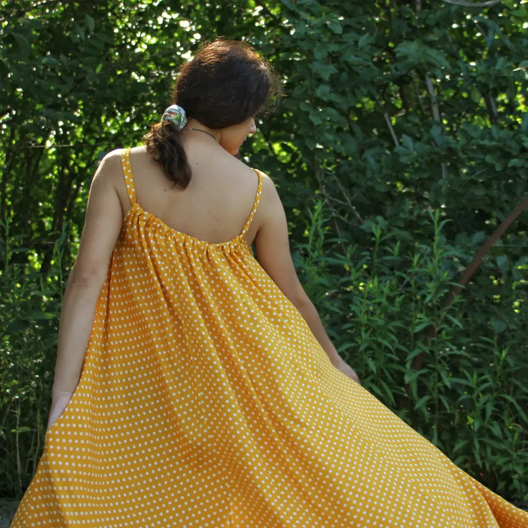Haljina sa širokim bretelama ima veoma elegantne nabore, a uz podešavanje dužine bretala lako ćete izabrati svoju dubinu dekoltea. Široka haljina biće originalan oversize model, ali ukoliko želite strukiranu haljinu, dovoljno je da zavežete pojas oko struka.